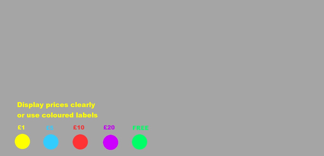 Display your name, town and phone number on cards in the photo. Price everything clearly or use coloured labels: see code below.